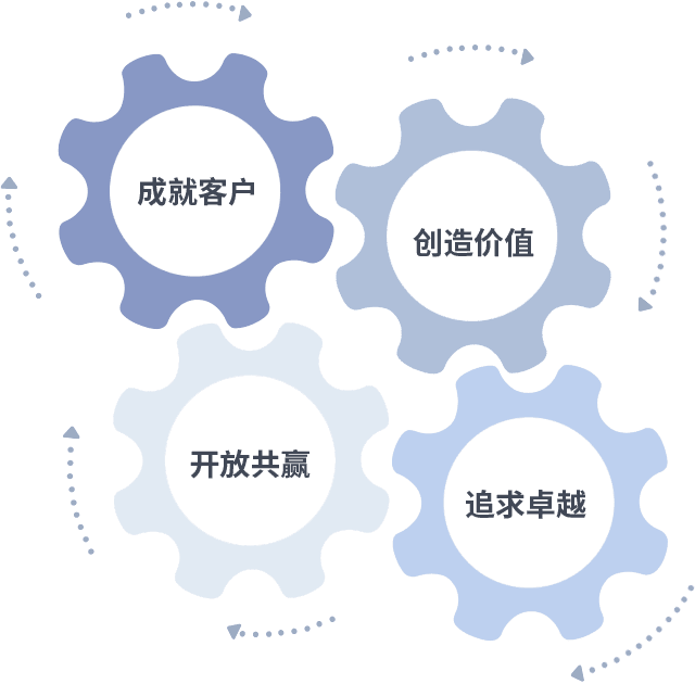 成就客户是一切决策的出发点,,,,创造价值是衡量所有工作的标准,,,,追求卓越是我们做事做人的态度,,开放共赢是我们的格局也是最终的结果。。。价值观的齿轮环环相扣,,,,推动着组织里的每个人不断向前。。。。