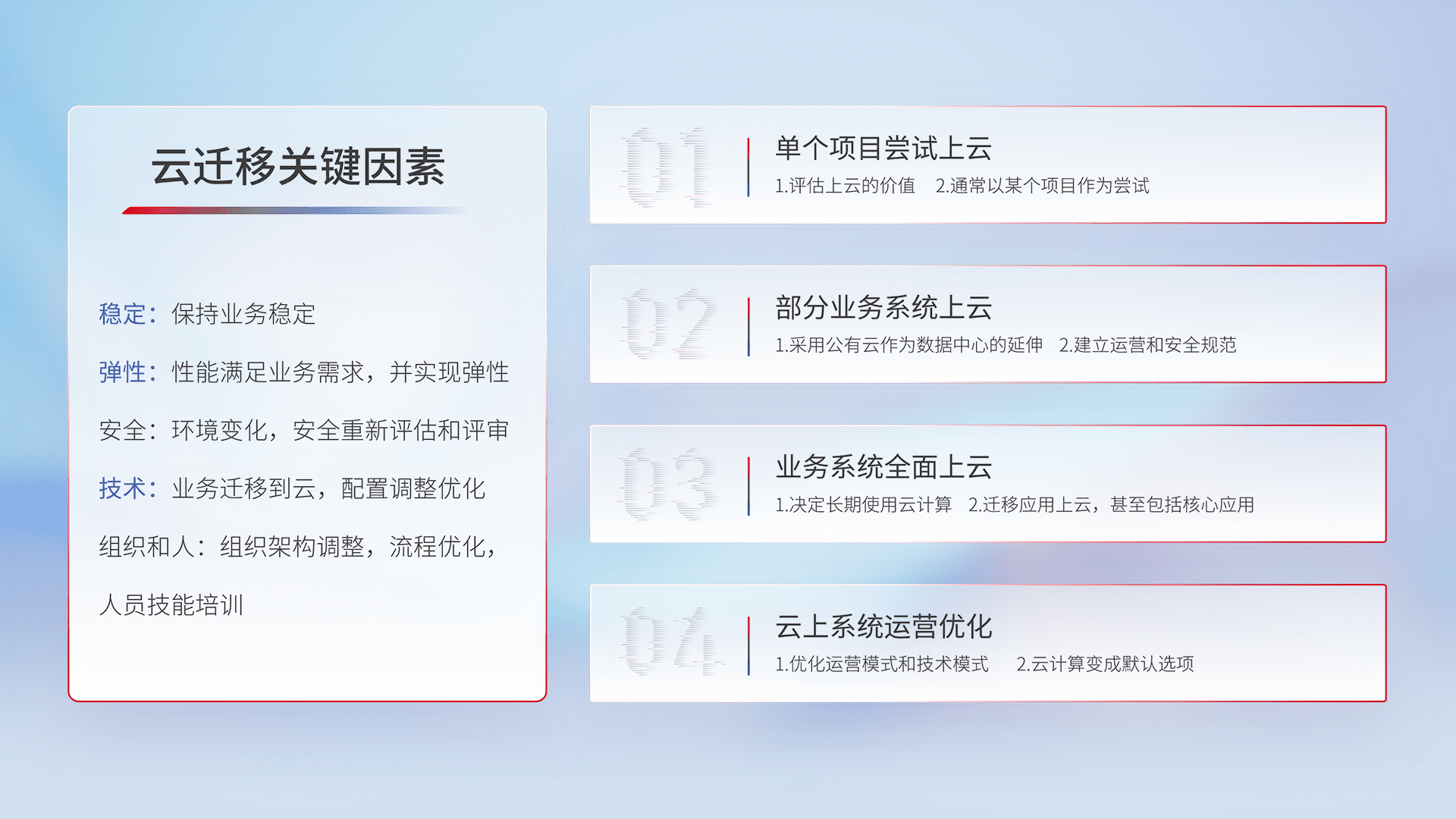结合实际业务,,从规划设计、、、云平台选型、、、云原生改造、、、、数据迁移、、、、集成交付,,,迁移全过程为客户识别最佳上云路径,,做好风险识别管理,,,设计网络架构、、、、身份权限、、安全审计合规、、操作审计、、日志审计、、、、监控告警策略、、、、多站点容灾设计等,,,,对云上基础设施进行整体规划,,提升IT治理水平,,以满足弹性、、、、高可用、、、、高性能的需求。。。